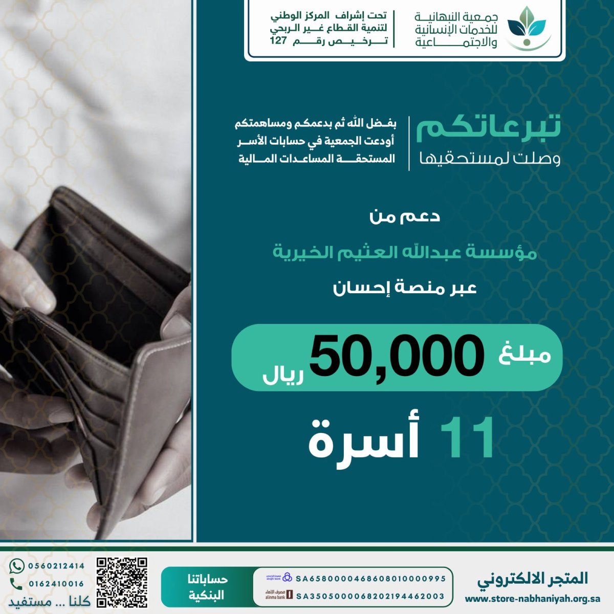 إيداع مبلغ 50,000 ريال لـ 11 أسرة بدعم سخي من مؤسسة عبدالله العثيم الخيرية عبر منصة إحسان