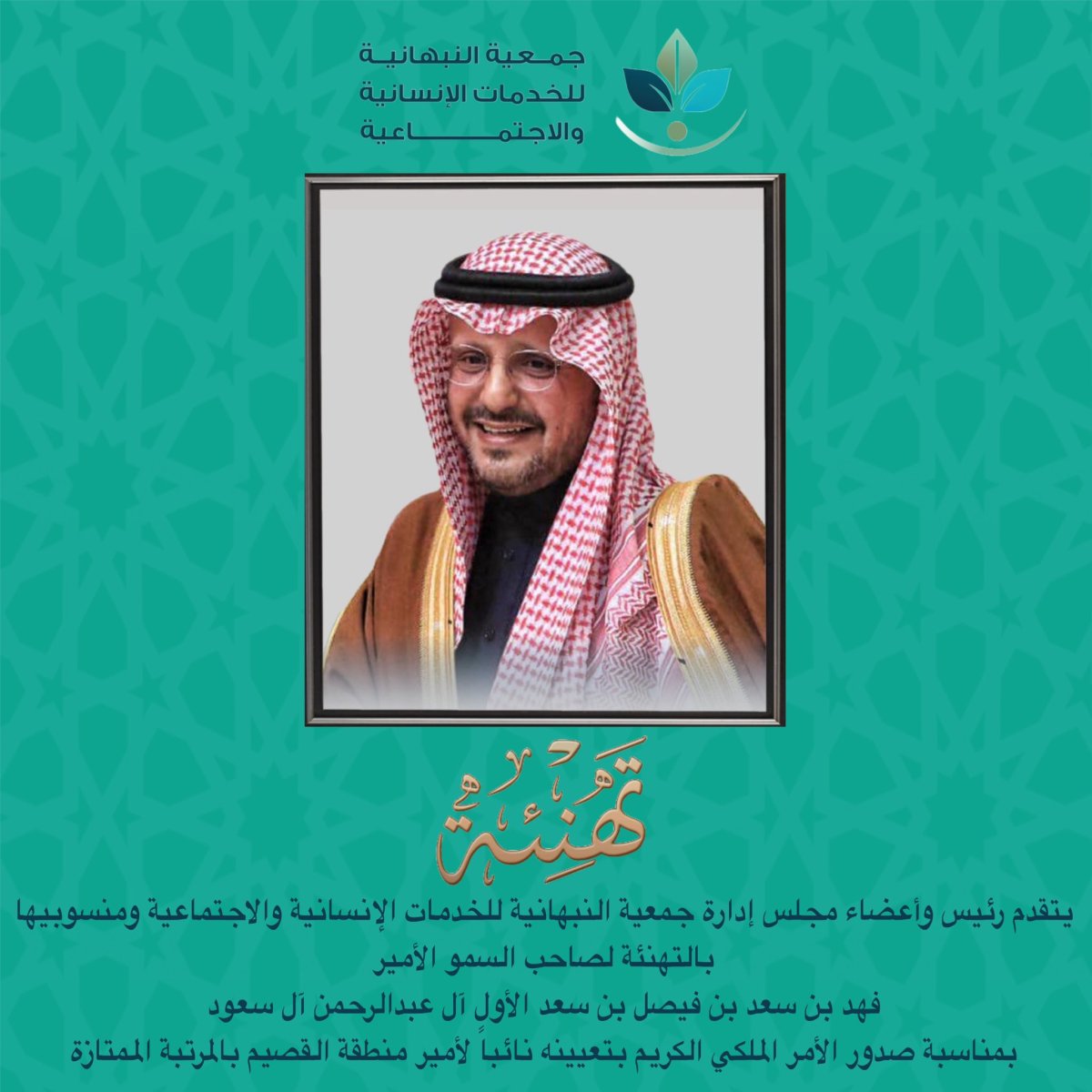 تهنئة ، صاحب السمو الأمير فهد بن سعد بن فيصل بن سعد الأول آل عبدالرحمن آل سعود بمناسبة صدور الأمر الملكي بتعيينه نائبًا لأمير منطقة القصيم، سائلين الله له التوفيق والسداد.