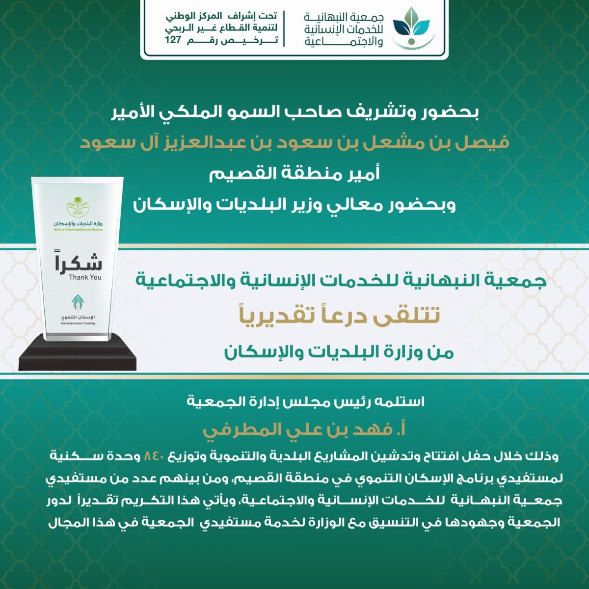 جمعـية النبهانية للخدمات الإنسانية والاجتماعية تتلقى درع تقديري من وزارة البلديات والإسكان